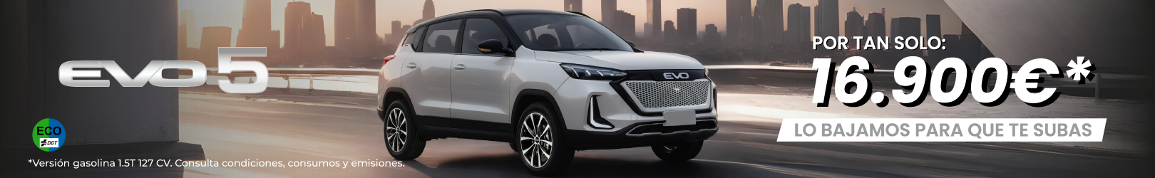 *EVO 5 Gasolina 1.5cc Turbo 93,5kw/127 CV. PVP Recomendado Financiando: 16.900€. Incluye IVA, transporte, Impuesto de Matriculación (IEMT) calculado al tipo general, descuentos del concesionario y fabricante y bonificación por financiar con CA Auto Bank, Spa Sucursal en España, según condiciones contractuales por un importe mínimo a financiar de 14.000€ con un plazo mínimo de 60 meses y permanencia mínima de 36 meses. Financiación sujeta a estudio y aprobación de la entidad financiera. PVP recomendado al contado: 18.900€. Oferta válida para particulares y autónomos, hasta el 31/01/2026 en Península y Baleares. No acumulable a otras ofertas o descuentos especiales. La versión visionada puede no corresponder con el vehículo ofertado. La versión visionada puede no corresponder con el vehículo ofertado. Los datos e imágenes mostrados son orientativos y pueden variar sin previo aviso.
